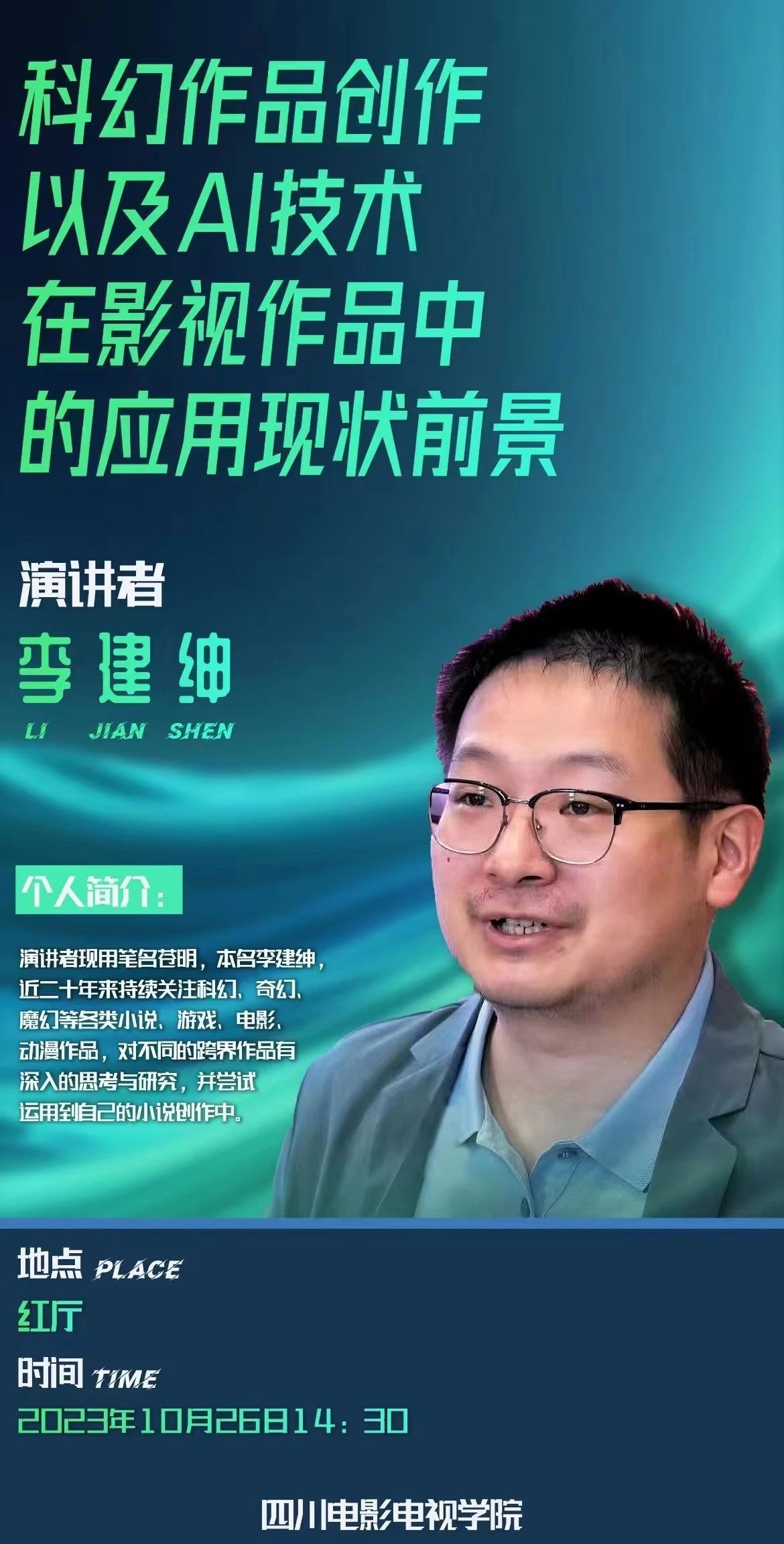 2023年10月26日,跨界艺术科幻作家李建绅(笔名苍明)应beat365平台官方网站电影学院邀请,在红厅以《科幻作品创作以及AI技术在影视作品中的应用现状与前景》为主题进行了演讲。