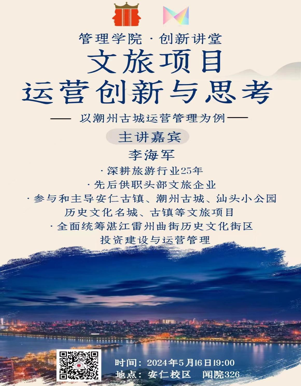 2024年5月16日晚19:00,由李海军老师所主讲的《文旅项目运营创新与思考》创新课堂在闻院326教室圆满举行,出席此次活动的成员有管理学院院长黄娟老师,创新班班主任陆通源老师以及第六届创新班的同学们。
