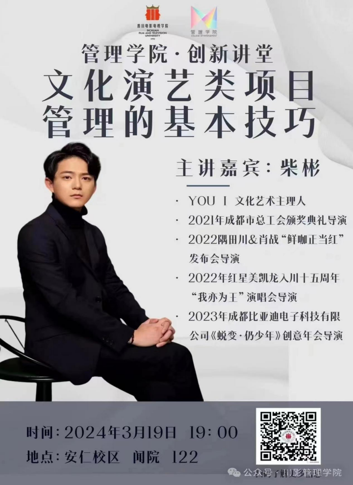 2024年3月19日晚上19:00,管理学院创新人才培训班在闻院122举办了主题为“文化演艺类项目管理的基本技巧”的课程。课程由柴彬老师主讲,黄娟院长和班主任陆通源老师也出席了本次课程。文化演艺项目是一种融合了艺术与技术、传统与现代的复杂工作,对于举办成功的文化演艺活动来说,项目管理的技巧至关重要。