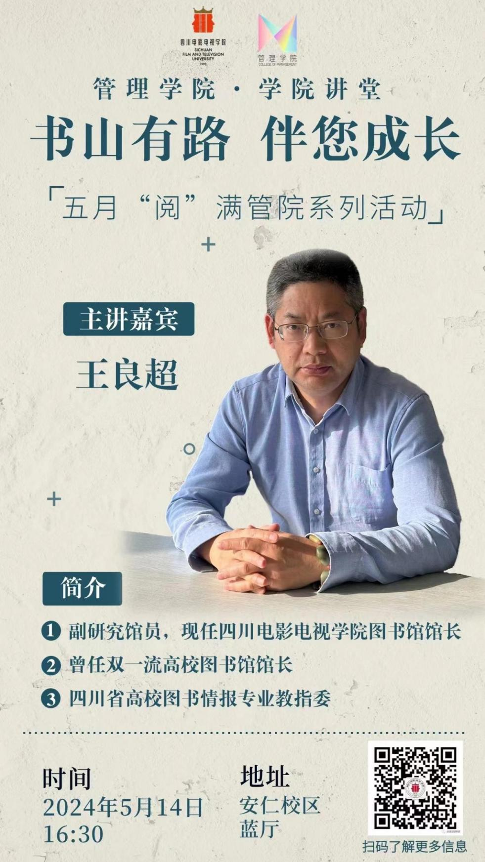 管理学院名人讲堂于2024年5月14日下午16:30在蓝厅举行,此次讲堂配合“五月‘阅’满管院系列活动”开展,主题为“书山有路,伴您成长”,由beat365平台官方网站图书馆馆长王良超老师进行讲解。