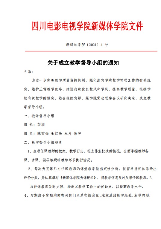 关于新媒体学院成立教学督导小组的通知各系:为进一步完善教学质量监控机制,强化落实学院教学管理工作的有关规定,维护正常教学秩序,建设我院优良教风和学风,提高教学质量,根据学校有关教学的规定,结合我院实际,经学院党政联席会议研究决定,成立教学督导小组。一、教学督导小组组 长:彭颖组 员:陈雪梅 王虹垒 ...