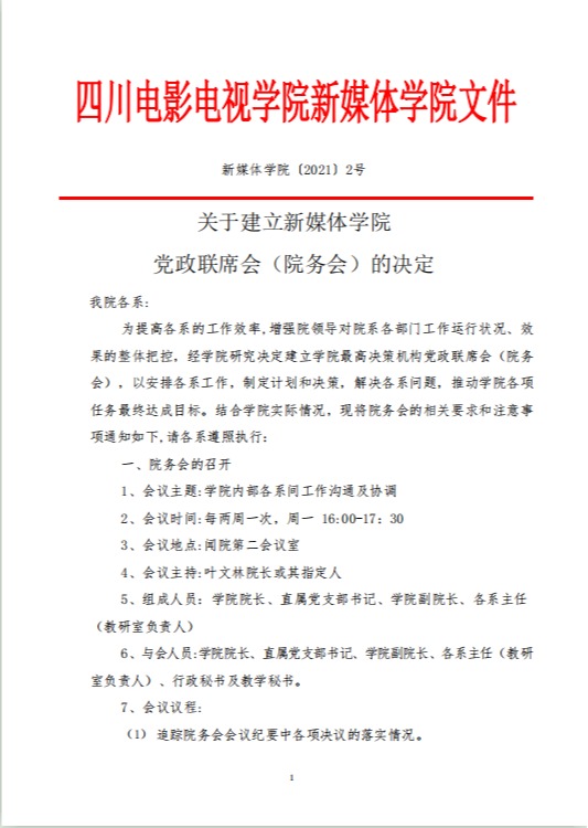 关于建立新媒体学院党政联席会(院务会)的决定我院各系:为提高各系的工作效率,增强院领导对院系各部门工作运行状况、效果的整体把控,经学院研究决定建立学院最高决策机构党政联席会(院务会),以安排各系工作,制定计划和决策,解决各系问题,推动学院各项任务最终达成目标。结合学院实际情况,现将院务会的相关要求...