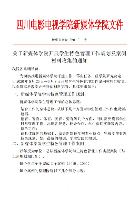 关于新媒体学院开展学生特色管理工作规划及案例材料收集的通知我院各系辅导员:为切实推进新媒体学院评建工作,落实任务,经学院研究决定,于2020年5月26日—6月8 日开展学生特色管理工作案例材料的收集,以保障本科教学合格评估材料完善。具体要求如下:一、新媒体学院学生特色管理工作规划:新媒体学院学生管理工作的...