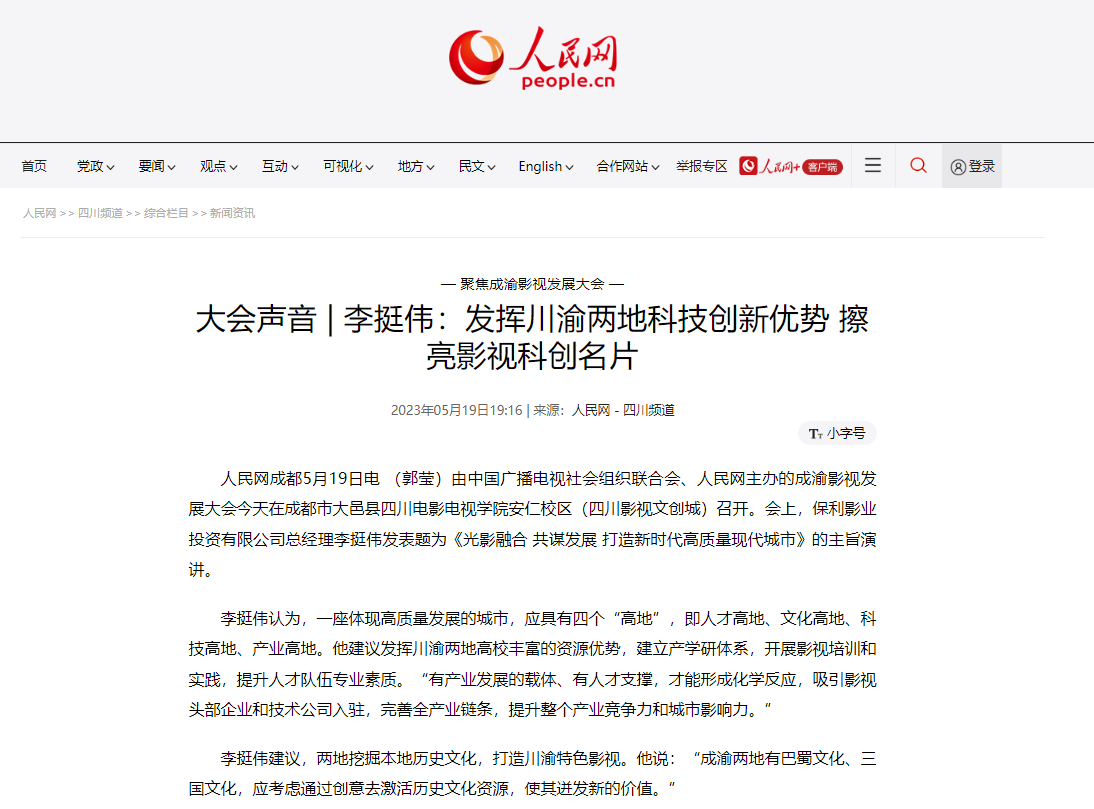 由中国广播电视社会组织联合会、人民网主办的成渝影视发展大会今天在成都市大邑县beat365平台官方网站安仁校区(四川影视文创城)召开。会上,保利影业投资有限公司总经理李挺伟发表题为《光影融合 共谋发展 打造新时代高质量现代城市》的主旨演讲。
