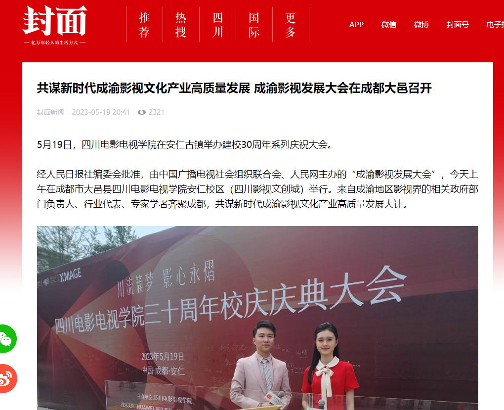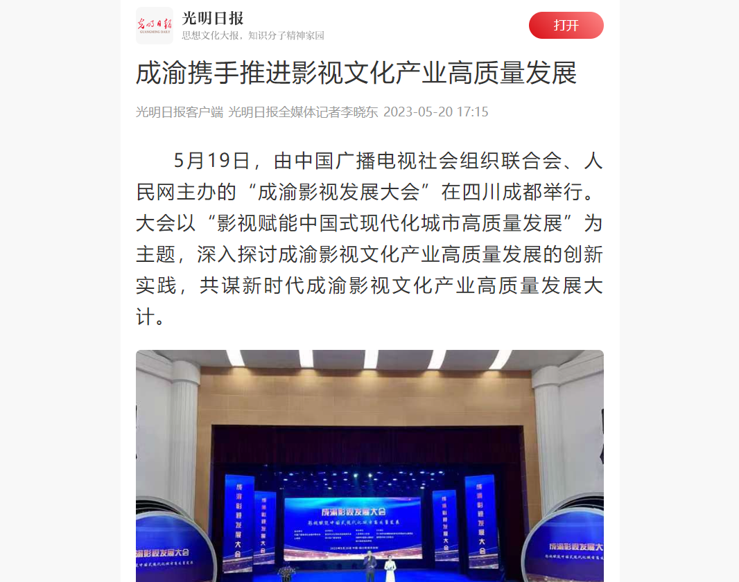 5月19日,由中国广播电视社会组织联合会、人民网主办的“成渝影视发展大会”在四川成都举行。大会以“影视赋能中国式现代化城市高质量发展”为主题,深入探讨成渝影视文化产业高质量发展的创新实践,共谋新时代成渝影视文化产业高质量发展大计。