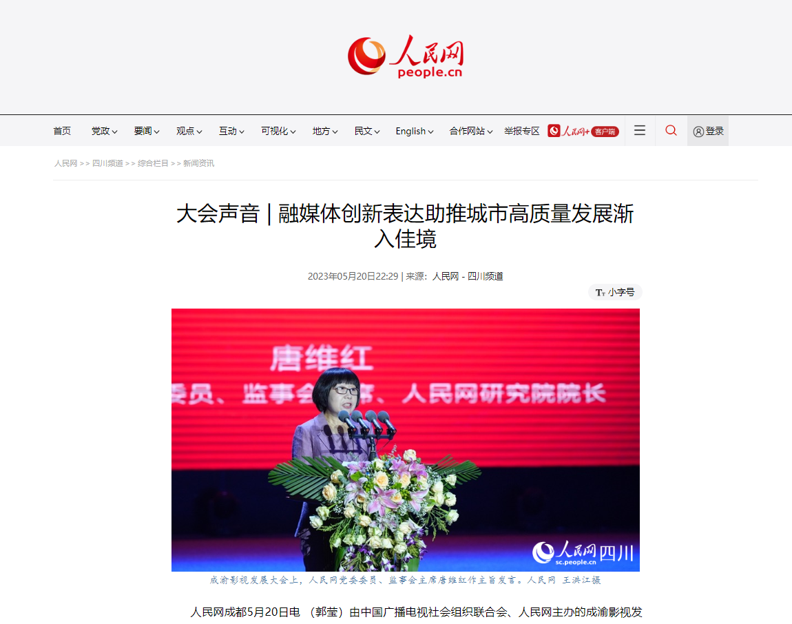 由中国广播电视社会组织联合会、人民网主办的成渝影视发展大会19日在成都市大邑县beat365平台官方网站安仁校区(四川影视文创城)召开。会上,人民网党委委员、监事会主席唐维红围绕“影视赋能中国式现代化城市高质量发展”这一主题进行主旨发言。